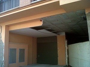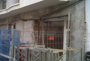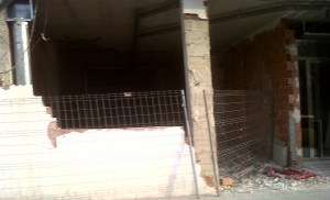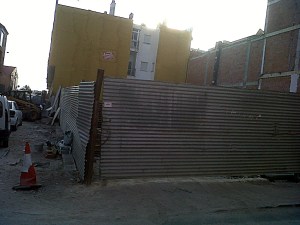 Detrás de las protecciones metálicas queda el hueco donde se levantaba un edificio de 6 plantas que se derrumbó por completo con el seísmo.