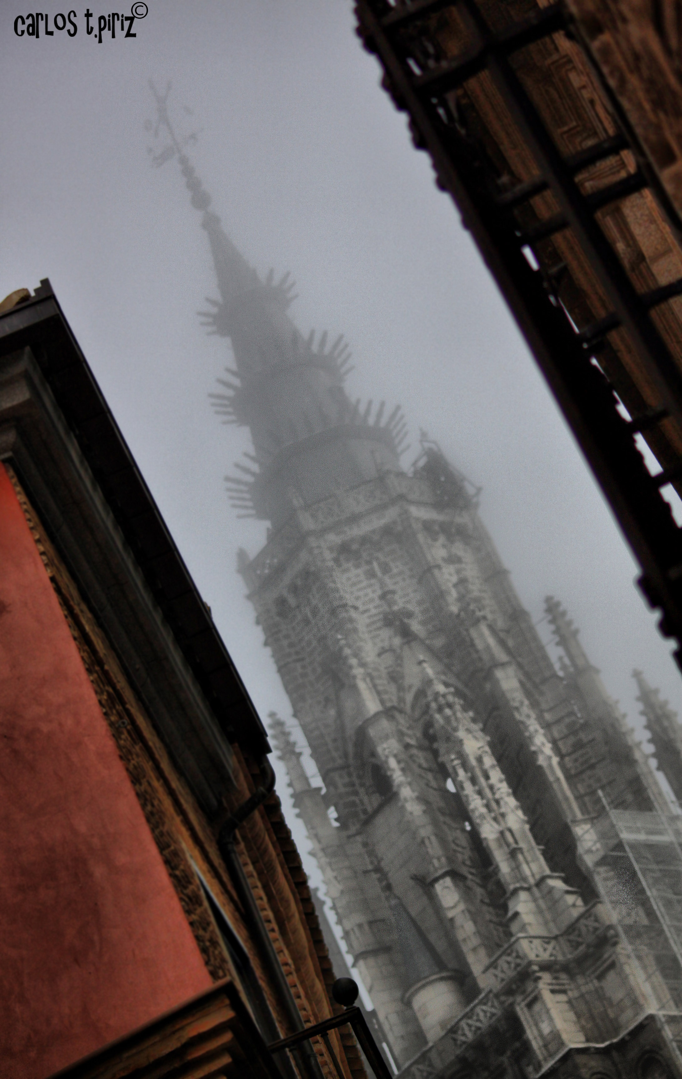 Difuminada entre la niebla, podemos distinguir la parte superior de la Torre de la Catedral de Toledo, sin duda una de las más hermosas de España, con su estilo gótico y cargado es una asombrosa obra en la que se alberga la campana más grande de España. Si si, así es, una campana que no puede ser tocada ya que la vez que se hizo de tal estruendo que causo, partió los cristales del casco antiguo de la ciudad, ¿asombroso verdad?.