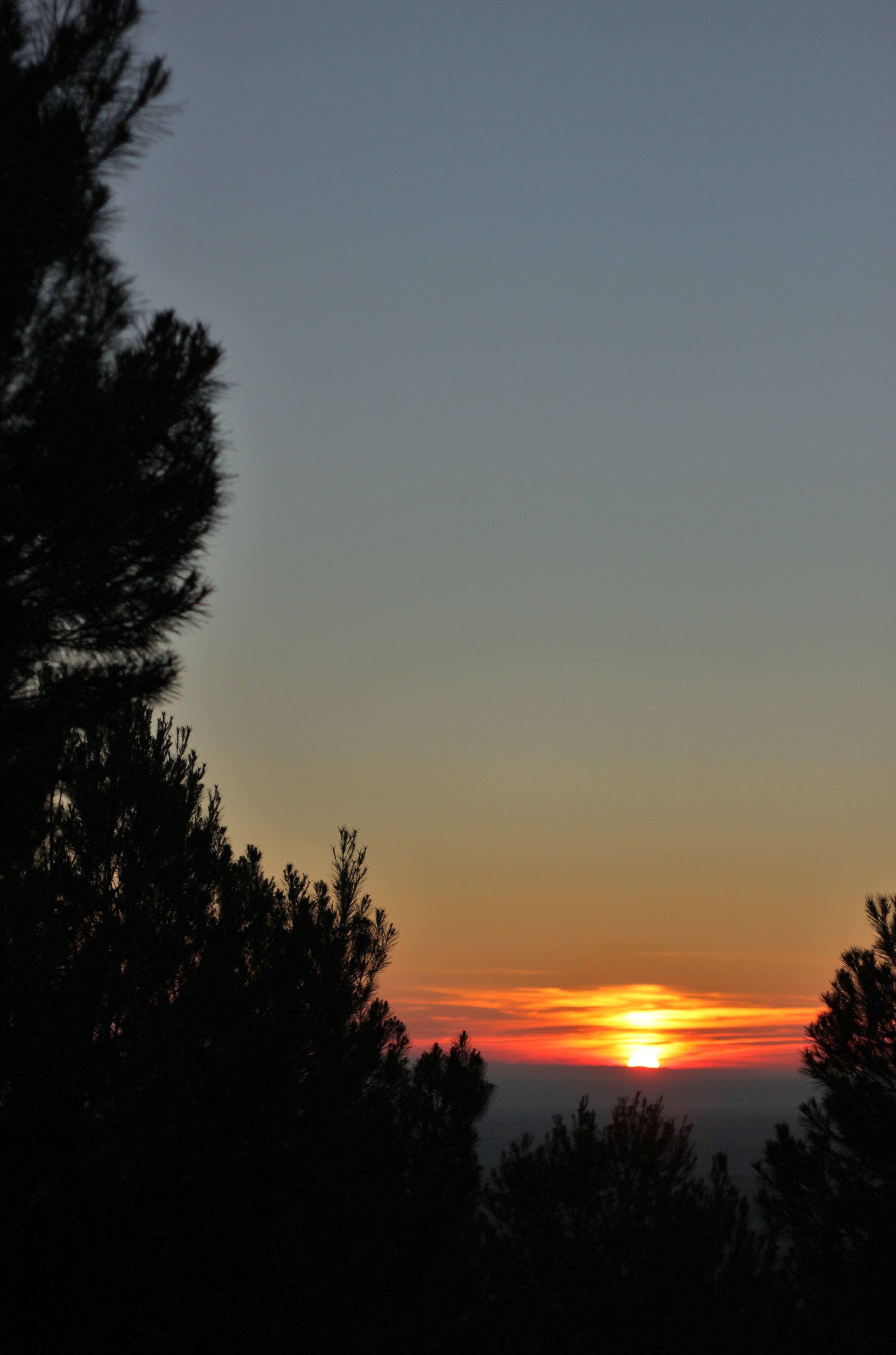 Aquí os muestro una puesta de sol, desde el cerro de mi pueblo, entre los pinos el sol un día más se marcha a dormir, y que agradable escena, sabiendo la situación en la que tome esta fotografía con mi novia, los dos completamente solos en aquel monte, viendo caer el día que daba paso a una noche estrellada, que nadie que viva en una ciudad vera nunca, una de esas noches que se quedan grabadas en los cinco sentidos.