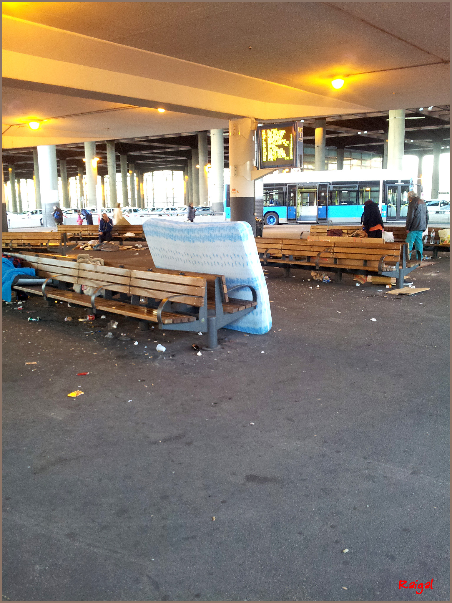 He esperado un rato, antes de tomar la foto, a que algunas personas se alejaran. No porque estorbaran, sino para preservar su intimidad y su dignidad, y salían en primer plano, reconocibles. En el edificio central de Atocha, junto a las paradas de taxis y de autobuses, la zona techada se ha convertido en improvisado dormitorio o alojamiento de docenas de indigentes a los que la crisis en particular, o el capitalismo en general, les han negado mejores oportunidades de alojamiento. Triste situación y baño matutino de realidad frente a la deshumanización en la que vivimos.