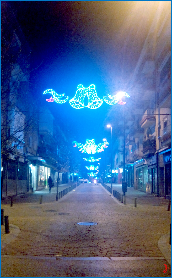 Pedro Laborde es una de las arterias comerciales de Vallecas (¿os he hablado ya de mi barrio?), a pocos metros de su cruce con Albufera en el Alto del Arenal tomé esta foto en una tarde inusualmente fría e inusualmente desierta. Luces azules de tono futurista iluminando adoquines desgastados de una populosa calle atrapada en un instante de vacío.
