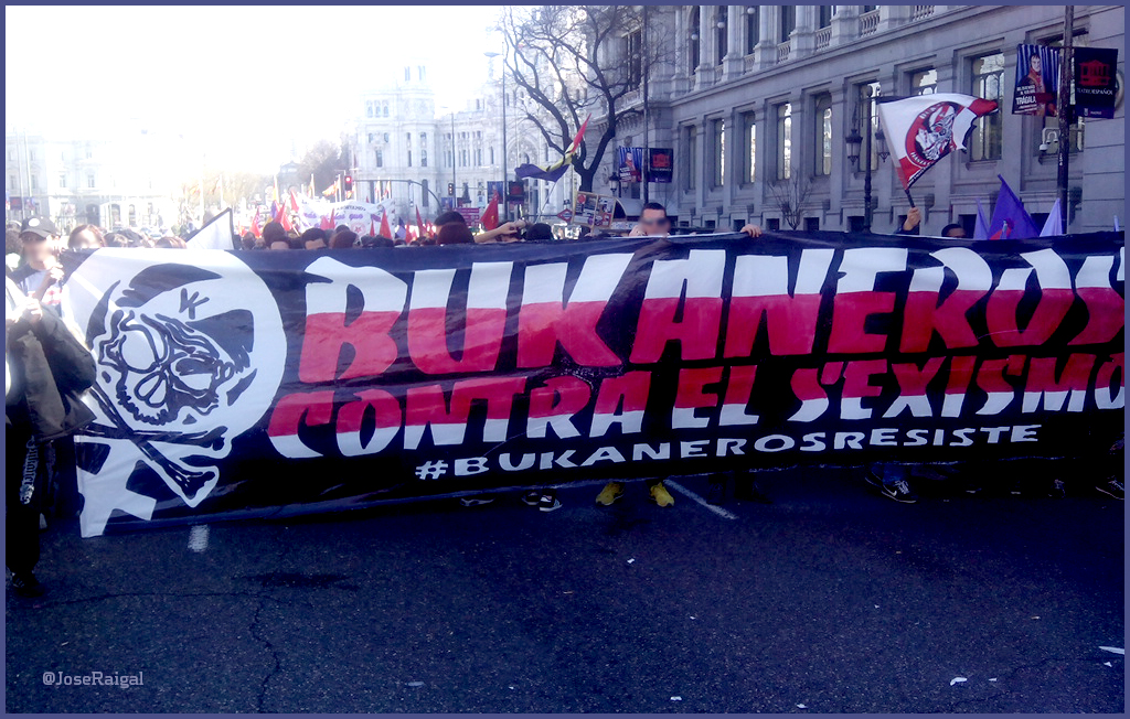 El fútbol no es una de mis pasiones, pero la hinchada vallecana del Rayo llama mi atención por lo atípica que es. Concienciada y roja, la gente de Bukaneros suele ocupar un espacio en los medios y en las redes con sus pancartas, siempre más allá de lo deportivo, cargadas de conciencia de clase y llamamientos progresistas. Y no se contentan con liarla parda (y roja) en el campo de Vallecas, sino que cuando se tercia, como en esta foto del 8 de marzo, tiran Albufera abajo hasta la manifestación de turno para hacer pedagogía entre la juventud contra el racismo, el machismo y lo que se tercie.