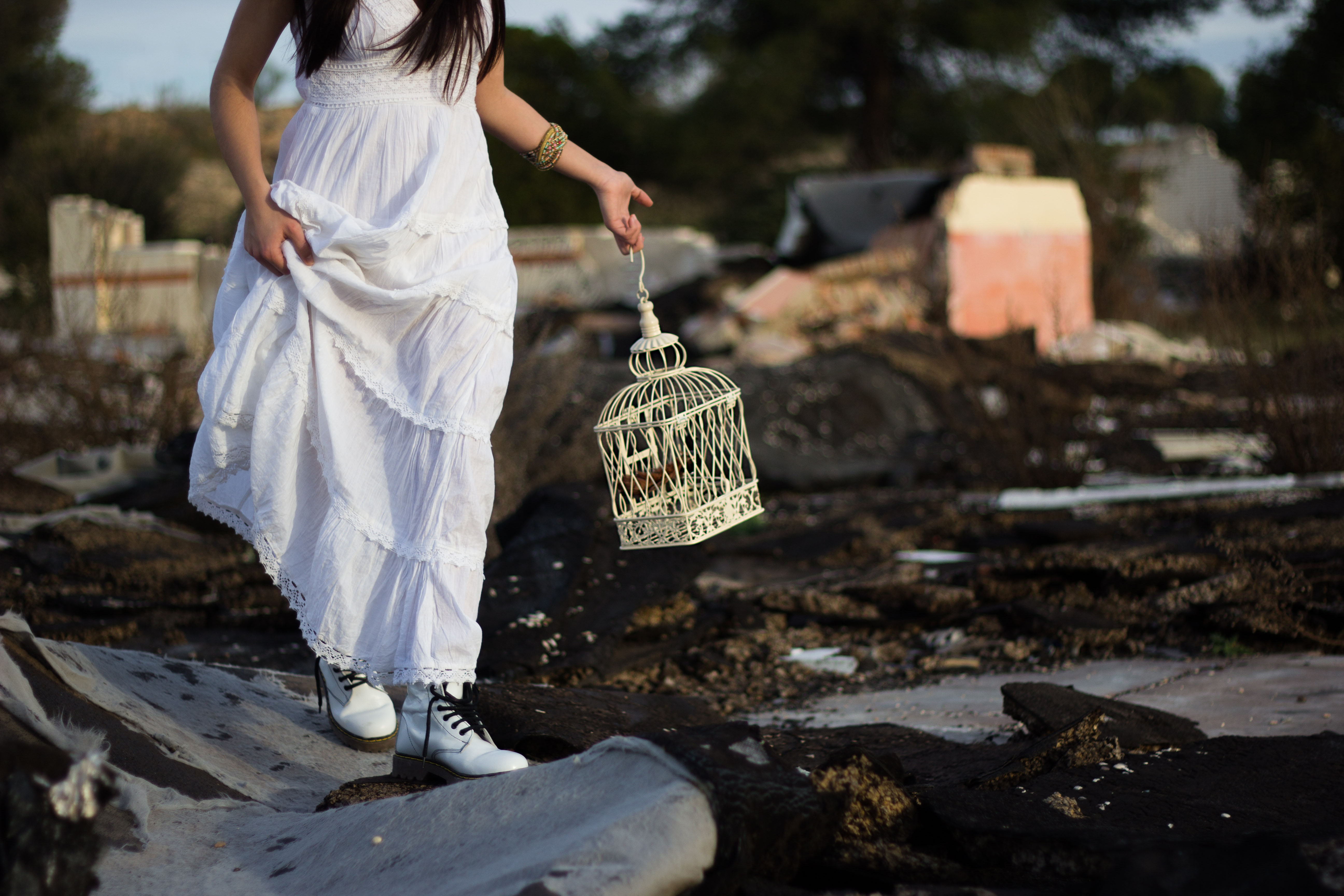 Un pájaro enjaulado, con ansias de escapar, cuyas plumas son de fuego, y resucita de sus propias cenizas cual ave fénix.