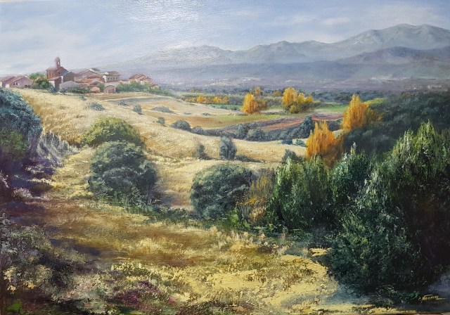 «Por Casa de Uceda» es un óleo sobre lienzo preparado. de 65×50 y fruto de una de mis salidas en solitario a pintar del natural a la maravillosa sierra de Madrid, cerca del embalse del Atazar, un 9 de noviembre del pasado, festividad de la Almudena.Y aunque firmado lo tengo pendiente de algún retoque en los planos medios.