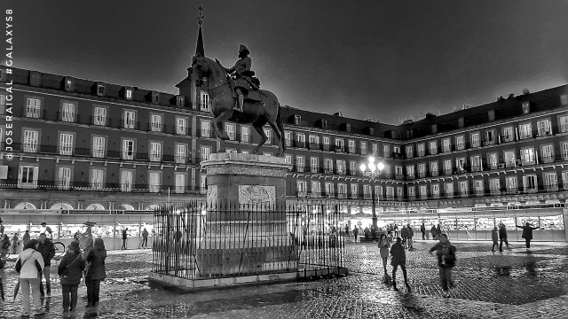 La Plaza Mayor, la de Madrid y cualquier otra de cualquier ciudad o pueblo de España, siempre dan juego fotográfico. Esta foto la tiré mientras acompañaba a la Jefa que firmaba ejemplares de su último libro, Quiéreme, o no, en la Feria de las Editoriales y las Librerías.