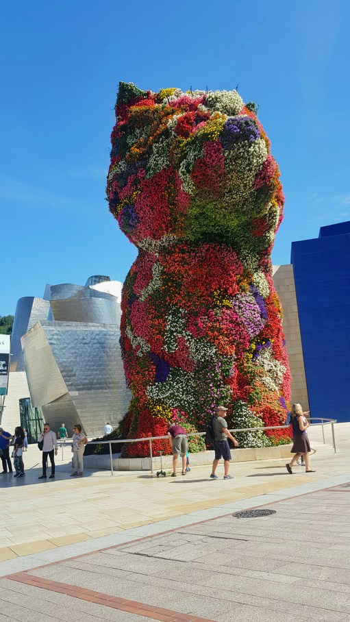 Puppy custodia las puertas del Museo Guggenheim de Bilbao, y por ahí comenzamos el viaje familiar.