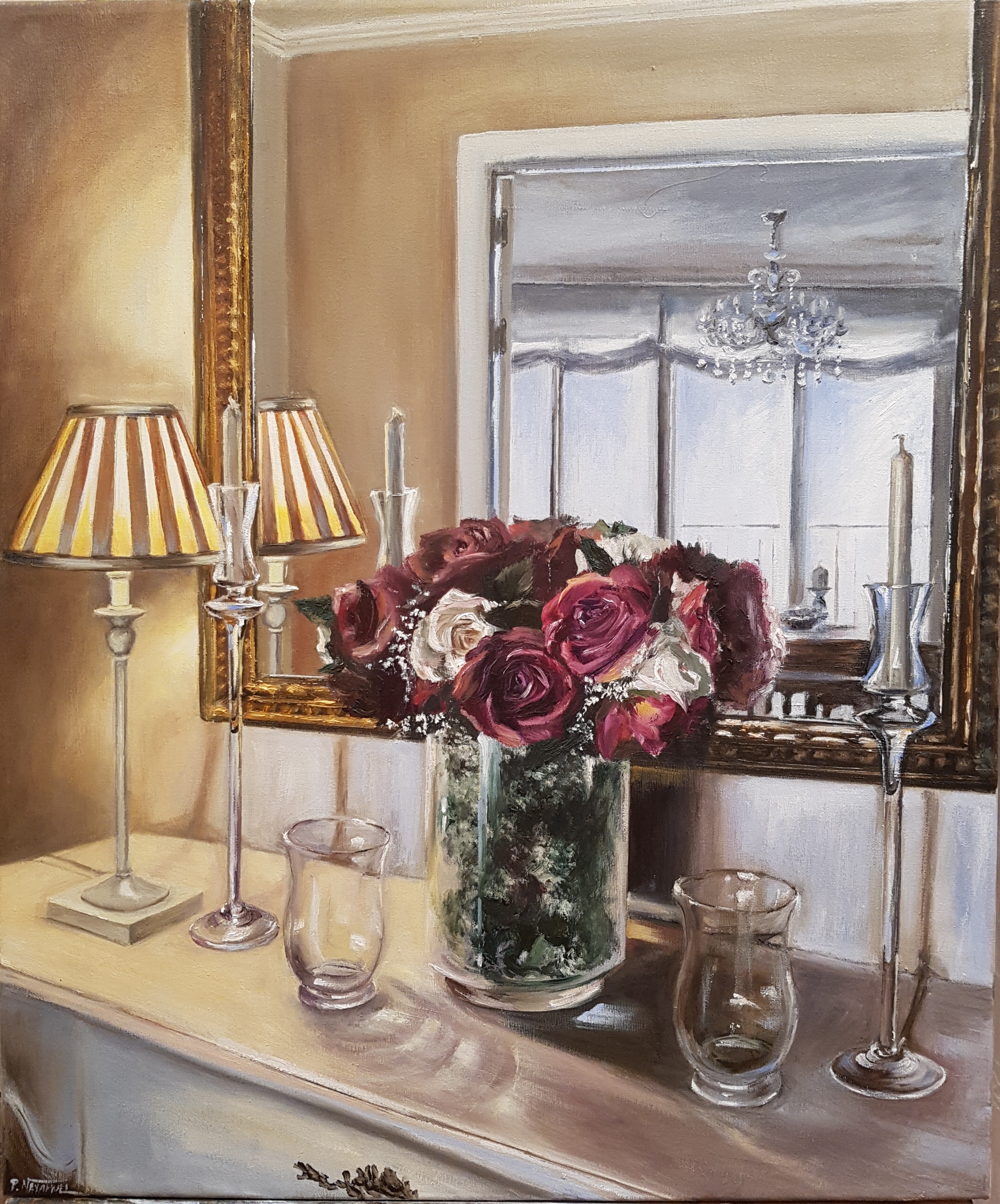 La primera obra que te muestro hoy, alguna vez ya la has visto por aquí, se llama «El espejo», es un óleo de sobre lienzo. 56 x 45.
