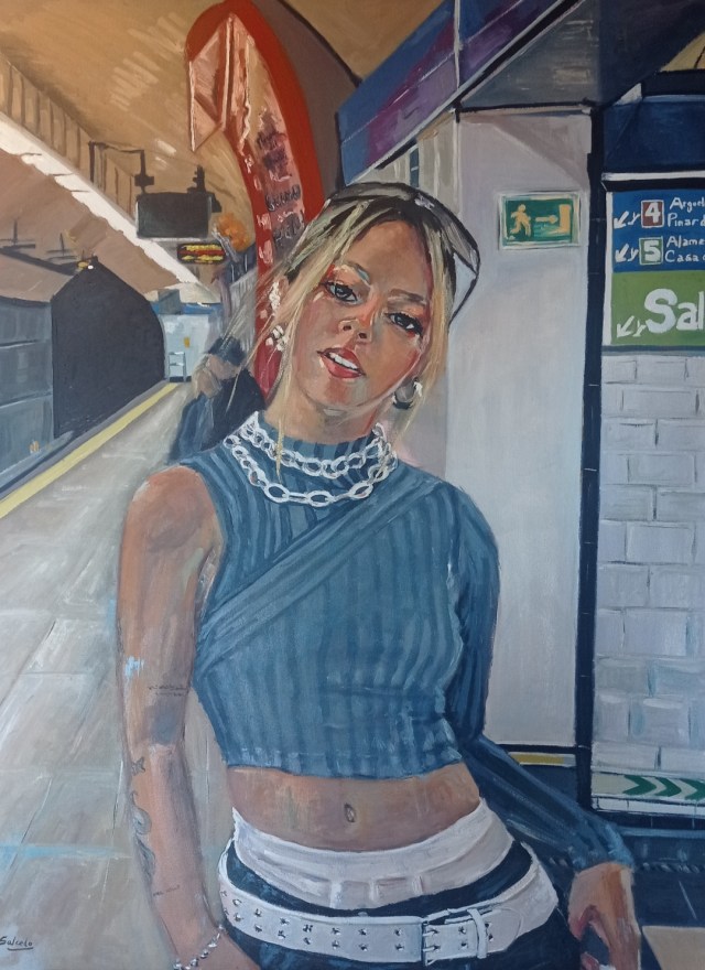 Muestra a una joven actual en el metro de Madrid. Con leves indicios en el fondo que nos transportan a distintos lugares de la ciudad, al Museo del Prado y con un guiño a pintores de otras épocas.