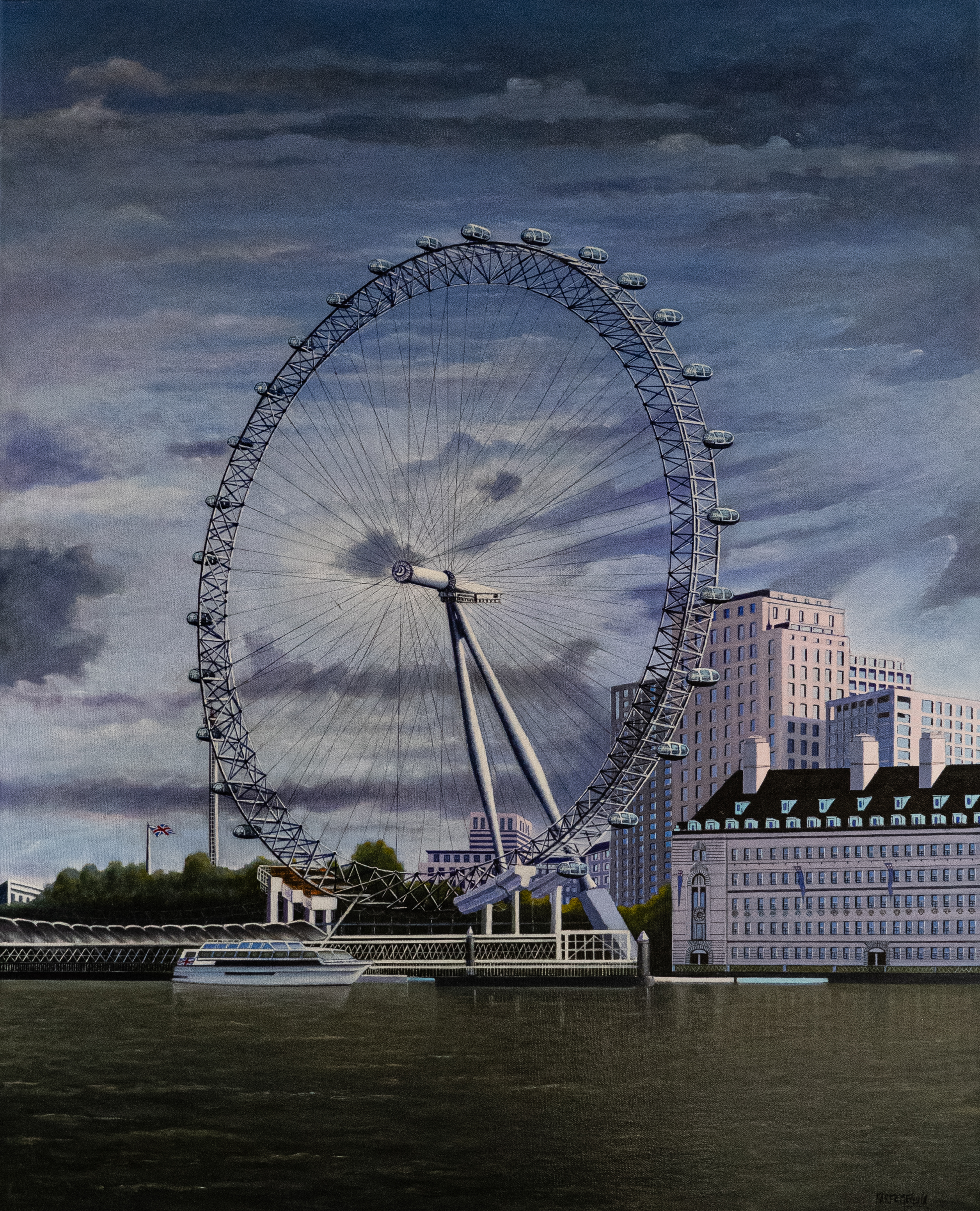 La gran Noria de Londres. Llamada por los Londinenses London eye (El ojo de Londres) tuve el honor de verla construir e inaugurar. Pues en esa época visitaba Londres tres y cuatro veces al año debido a mi trabajo dedicado al Turismo internacional. A pesar de la complejidad disfruté muchísimo sobre fondo en el dibujo previo. Pues todas mis obras figurativas realistas se basan en el dibujo base. Sin él sería imposible realizar obras tan complejas, especialmente para mí. Al final quedé muy satisfecho con el trabajo realizado y este es el resultado. Ha estado seleccionada en varios certámenes de arte realista.