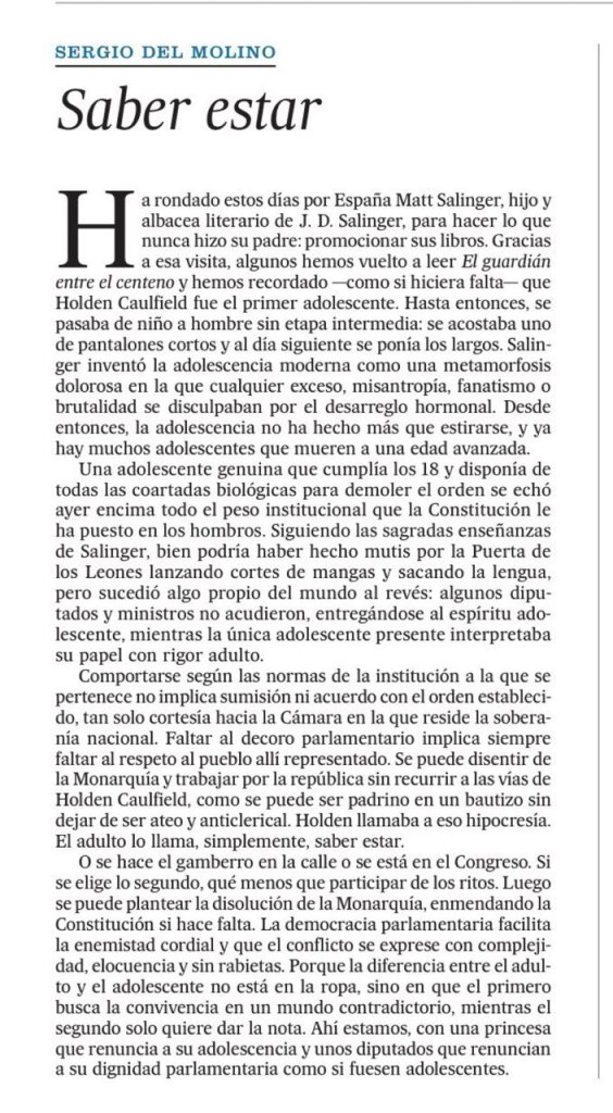 El tuit incluye la fotografía de la columna de opinión del escritor Sergio del Molino publicada en El País.