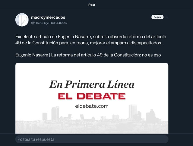 Parten para abrir el debate de un tuit de Macro y Mercados (@macroymercados) sobre un artículo de Eugenio Nasarre publicado en el diario digital El Debate: «La reforma del artículo 49 de la Constitución: no es eso«