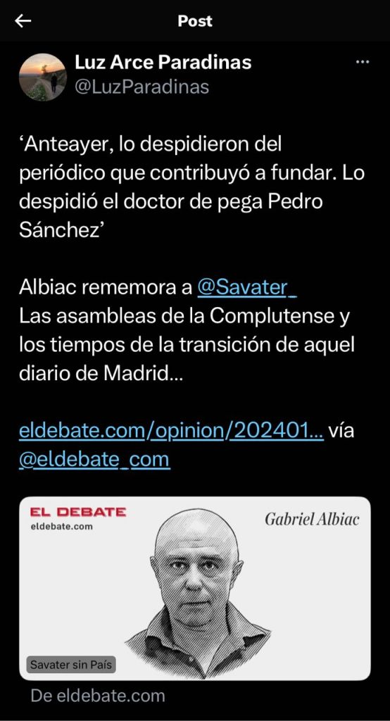 Parten del tuit de Luz Arce Paradinas que comenta la columna de opinión de Gabriel Albiac en el diario el debate.com Savater sin País.