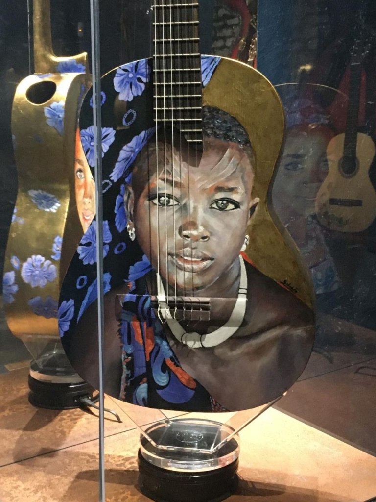 Guitarra dorada con pan de oro y pintada con óleo y que está expuesta en el magnífico Museo Cromática de Toledo. Precioso lugar lleno de arte y música, donde cada pieza ha sido creada por grandes artistas.