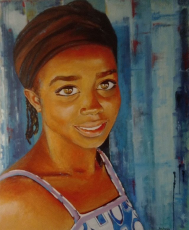 Muestra a Lamarana con fondo de pan de oro y su pañuelo de flores, preciosa joven de Guinea Bissau, su belleza, su inocencia y alegría.