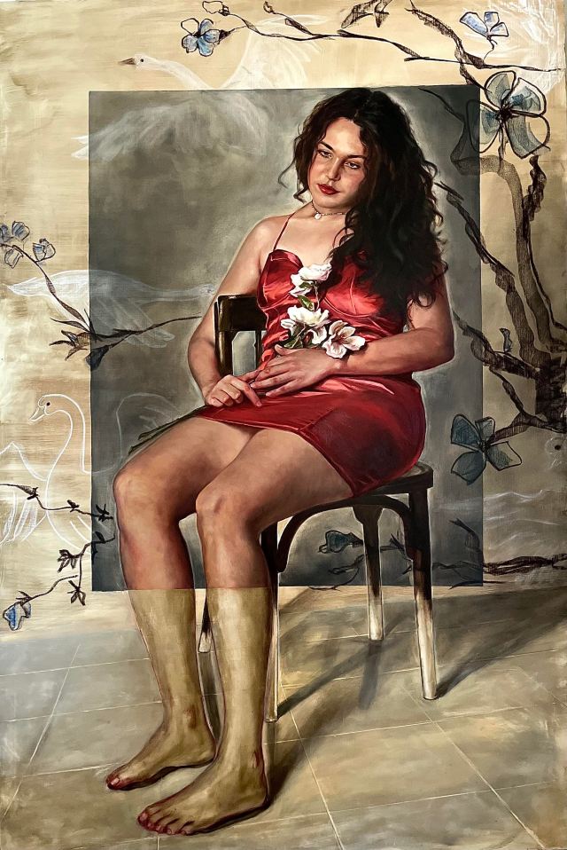 Las flores sobre el regazo significan la ausencia de la persona que se amó, la caricia que dejó en su recuerdo, ese querer perpetuar algo y ya no poder. La tristeza de la mirada, el dolor del alma en los ojos de ella. Pero es algo sosegado, aceptado. Era una ruptura necesaria, una relación que no podía continuar. Consciente de que llega a su fin.