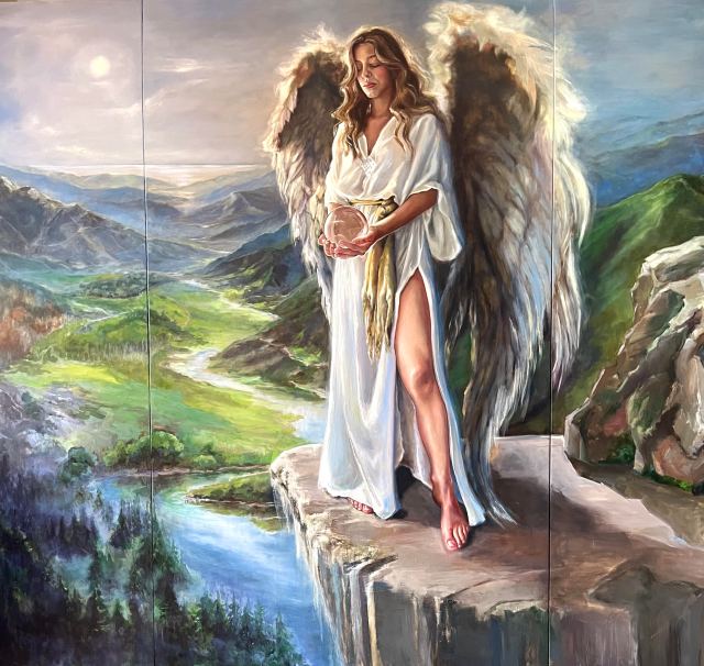 Una mujer ángel que sostiene entre sus manos una bola de cristal, metáfora de sostener y guardar el mundo (Custos Mundi), como ya lo hiciera el Salvator Mundi de Leonardo, de donde esta obra toma parte de su inspiración.