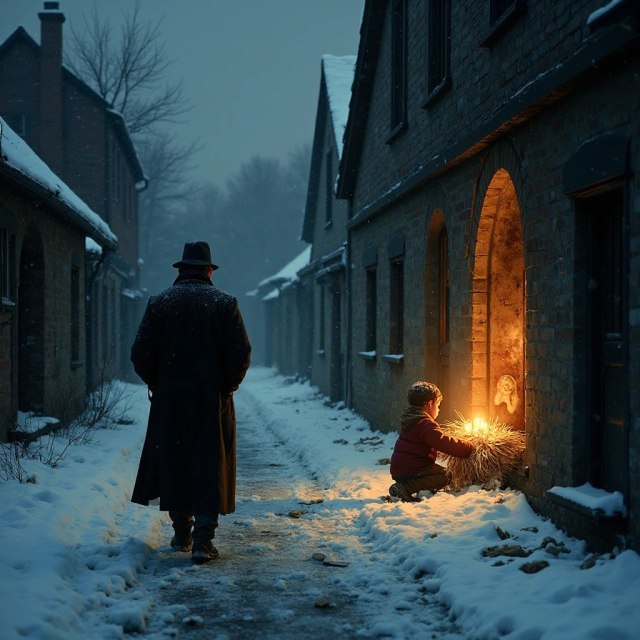 En un rincón, bajo una manta mugrienta, un niño sostenía la figura entre sus brazos. Estaba muy flaco, con la cara sucia y los labios morados por el frío. Sus ojos eran dos pozos oscuros, llenos de miedo y de una soledad tan honda que helaba más que la nieve. Había envuelto la figura con torpeza en restos de papel, como si fuera un regalo para sí mismo.