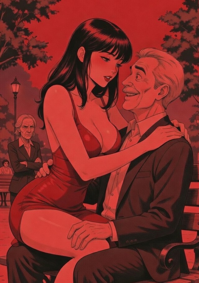 Lola llevaba coqueteando con Gustavo varias semanas. Todo empezó con encuentros casuales en el portal: un saludo efusivo, un roce en el brazo al pasar, comentarios sobre el clima que derivaban en charlas sobre su soledad. «Eres tan vital, Gustavo, no como los viejos del barrio», le decía con una sonrisa inocente, cruzando las piernas en el banco del jardín compartido, su vestido corto subiendo lo justo para captar su mirada. Él respondía con galantería, halagado por la atención juvenil, recordando días de vigor perdido. Lola urdía su trama con precisión: historias fingidas de desamparo –un «padre ausente» que la dejó en la pobreza–, lágrimas estratégicas que lo impulsaban a consolarla con abrazos paternales que ella convertía en toques sugerentes. Investigaba su vida: espiaba sus rutinas, sus visitas al banco para confirmar la pensión, sus llamadas a Marta que escuchaba a través de la pared delgada. El plan era escalar el coqueteo a seducción física, cegarlo con pasión para que rompiera el compromiso, casarse rápido y orquestar un «accidente» –envenenamiento lento con hierbas indetectables, simulando un infarto natural durante un viaje–. «Ya haré yo por cobrarla rápido», pensaba, imaginando lujos sin esfuerzo.